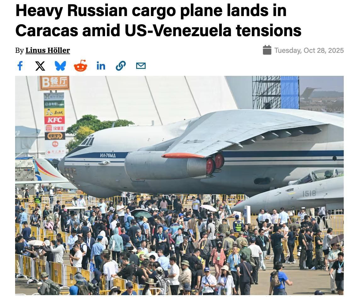 Российский транспортный самолет Ил-76 приземлился в столице Венесуэлы - на фоне слухов о вероятной атаке США на Венесуэлу, сообщает Defence