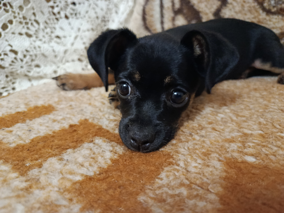 У меня новенькое, маленькое и миленькое существо в доме появилось. Эта малышка, честно говоря, не очень понятной породы. По словам продавца, помесь пинчера с джек рассел терьером, но что вырастет? Выбирали вместе с моим взрослым сыном. В коробке было две собачки. Одна побольше, другая поменьше. Мы взяли мелкую штучку. Она была тогда очень тихой. Ну, это её качество уже в прошлом. Носится по дому как ракета и всё время всё треплет и кусает. Как устанет-милашка ! Вот полусонную её можно гладить и ласкать. Не лает, иногда в пылу игры рычит. Её "тяф' слышали всего пару раз. Ей пошёл четвёртый месяц и сын выразил опасение по поводу её размера. Уж больно мала, как бы нашу кроху хищная птица не утащила со двора. Я испытываю больше оптимизма-вырастет!
