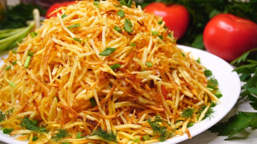 О: Картофель можно нарезать очень тонкой соломкой вручную или использовать овощечистку для получения тонких лент.