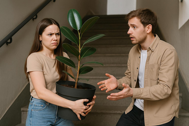 В один из таких визитов он столкнулся на лестнице с девушкой, которая тащила вверх огромный фикус в горшке.