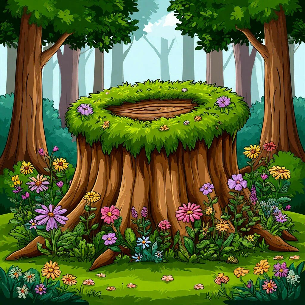 В самом сердце леса стоял старый-престарый пень. Когда-то это было могучее дерево, под чьей кроной собирались все лесные жители. Но теперь от дерева остался лишь невысокий пенёк, покрытый морщинами-трещинами. Он чувствовал себя ненужным и забытым. Однажды Масяня, пробегая мимо, услышала тихий-тихий вздох. Она остановилась и присмотрелась: пень казался таким грустным, что у мышки сжалось сердечко. — Что случилось? — ласково спросила она, поглаживая шершавую кору. — Все обо мне забыли, — прошептал пень. — Раньше птицы вили на мне гнёзда, белки прятали орехи, звери отдыхали в моей тени. А теперь я никому не нужен... Масяня не могла с этим смириться. Она решила превратить грустный пень в самое уютное место в лесу! Вместе с друзьями они устроили настоящий праздник украшений: Белочка Белла принесла самый мягкий зелёный мох, чтобы укрыть «лысинку» на макушке пня. Зайка Малютка накопал душистых лесных фиалок и посадил их в трещинки. Ёжик Пыхтелька прикатил несколько красивых разноцветных камуш