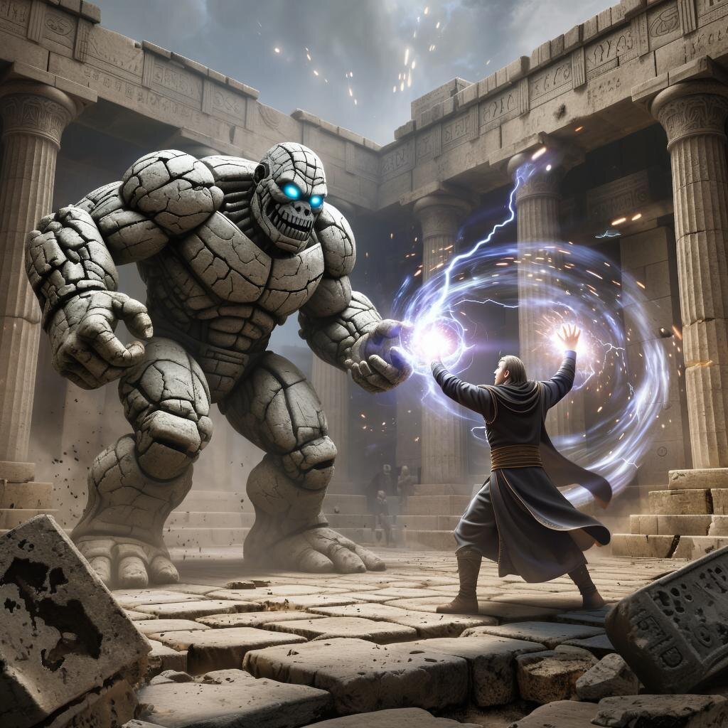 1 куплет *** За дело своё важное радея, И с толком, расстановкой, чувством, Два опытных, могучих чародея Бахвалились магическим искусством. *** Они творили и творили заклинания, То насылая друг на друга шторм, Снося вокруг законы мироздания, То призывая молнию и гром. *** Припев *** Почувствовали оба вдохновение, Войдя в какой-то дикий, страшный раж, И применяют всё своё умение, Почувствовав магический кураж. *** И оба не приемлют поражение, Но тот, что младше на десяток лет, Ещё способен выиграть сражение, Поскольку есть последний аргумент. *** 2 куплет *** Прочесть заклятие – это не проблема И максимум урона причинить. Взять и создать железного голема – Проблема – его после подчинить. *** Големы на людей весьма похожи: Он получеловек, полувампир. Обоих магов уничтожить может, А после – магов уничтожить целый мир. *** Припев *** Почувствовали оба вдохновение, Войдя в какой-то дикий, страшный раж, И применяют всё своё умение, Почувствовав магический кураж. *** И оба не приемлют пораж