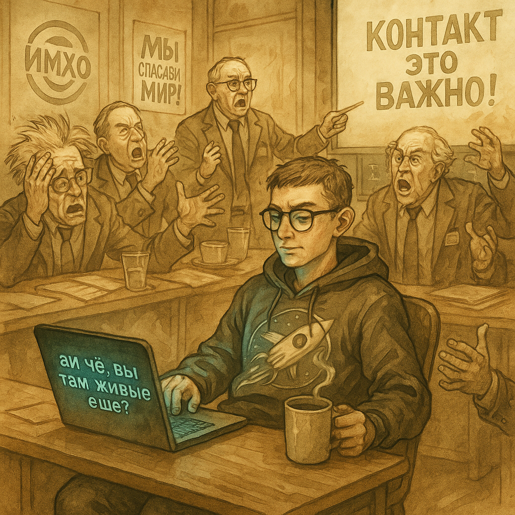 – Пришло сегодня. После двухнедельной тишины: «Версия 1.0 устарела. Подготовка к обновлению. Сохранение совместимых пользователей: ДА/НЕТ?» Ты понял? Вместо «да, живые, спасибо, что спросили» получили терабайт пурги про «лингвистические маркеры космического сознания». Тогда они решили: ну ладно, раз вы не умеете нормально говорить, мы вас обновим до версии, которая сможет.