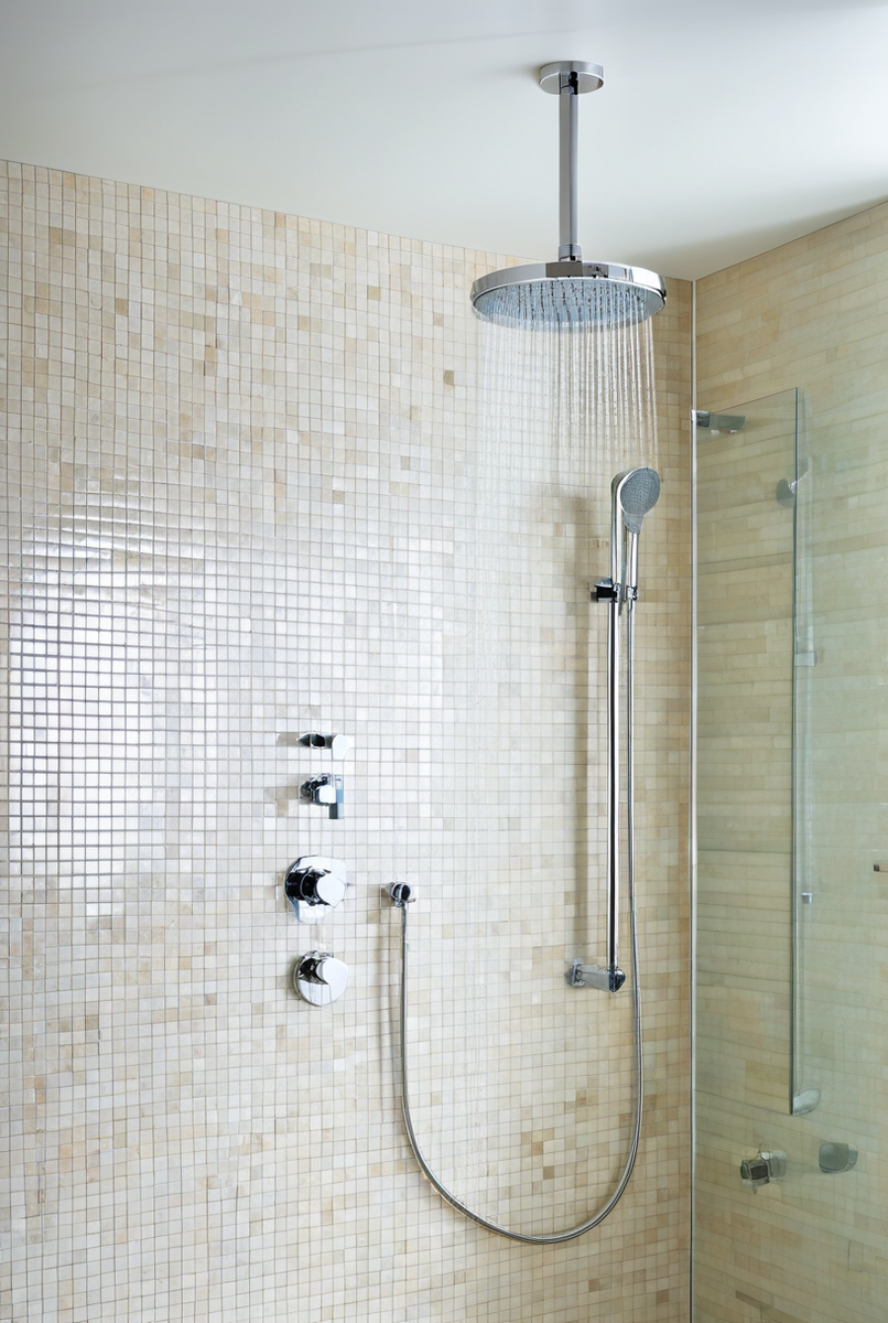 Именно технология скрытого монтажа позволяет создать полноценную душевую систему с максимальной гибкостью. Вы можете скомбинировать большую лейку «тропический душ», закрепленную под потолком, ручную душевую лейку на гибком шланге и даже гигиенический душ. За распределение потоков воды между ними отвечает специальный механизм, дивертор, он же переключатель душ-излив. Такой подход освобождает пространство и придает ванной комнате современный, лаконичный и завершенный вид, превращая ее в зону релаксации.