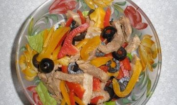 Ингредиенты: - 1 небольшой язык - 0,5 банки оливок - 3 консервированных огурца - 1 болгарский перец - майонез - томатная паста - соль Приготовление: Язык отварить, очистить от пленки, нарезать кубиками. Оливки нарезать колечками, огурцы и перец - кубиками. Все смешать, посолить, заправить смесью майонеза с томатной пастой.