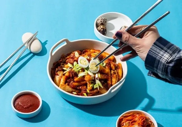1 ч 30 мин 4 порции Ингредиенты: - мука рисовая - 400 г - кипяток - 250 мл - соль - 1 ч. л. - кимчи - 1 уп. - бекон сырокопчёный - 1 уп. - яйцо перепелиное - 4 шт. - лук репчатый - 1 шт. - соус соевый - 40 мл - паприка - по вкусу - сахар - 1 ч. л. - кунжут - по вкусу - лук зелёный - несколько перьев Приготовление: 1. Рисовую муку смешайте с солью и постепенно добавляйте кипяток, пока тесто не станет плотным и не перестанет липнуть к рукам. 2. Сформируйте из теста шар и дайте ему отдохнуть под полотенцем 30 минут. Затем раскатайте из него тонкие колбаски и нарежьте их на небольшие палочки около 5–6 см. 3. Наполните кастрюлю емкостью 3 л водой, поставьте на плиту. Доведите воду до кипения и выложите в неё токпокки. 4. Убавьте огонь и варите токпокки 15 минут. По истечении этого времени отбросьте изделия на дуршлаг и ополосните холодной водой. Чтобы токпокки не слиплись, можно добавить к ним немного кунжутного масла. 5. Репчатый лук нарежьте полукольцами, а бекон — соломкой. 6. Обжар
