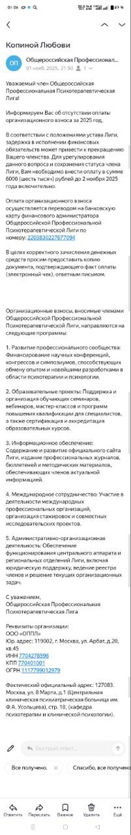 Так что ещё более очевидно становится, что мошенники активизировались и пытаются обмануть психологов, так как сейчас подходит период оплаты членских взносов.
