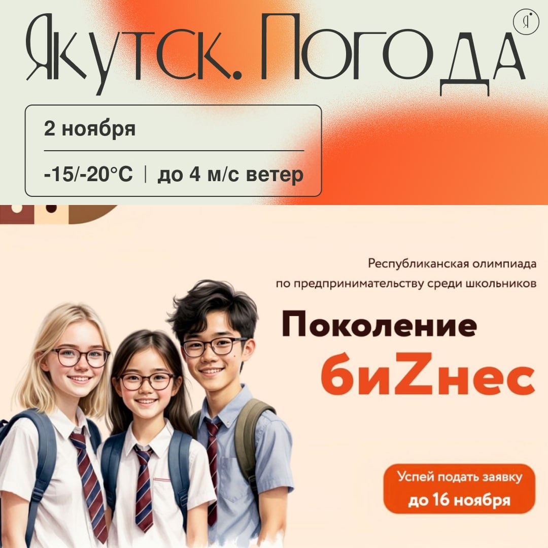 Доброе утро! Центр «Мой бизнес» проводит республиканскую олимпиаду по предпринимательству для школьников Участники могут проверить свои способности, изучить основы бизнеса и побороться за денежные призы. К участию приглашаются учащиеся 8-11 классов Олимпиада проводится в трёх номинациях: «Траектория будущего» (создание и производство товаров и услуг); «Точка роста» (развитие креативных индустрий и IT-технологий); «Мой добрый бизнес» (развитие социального предпринимательства). Победители получают дипломы и денежные призы в размере 50 тысяч рублей. Регистрация открыта до 16 ноября. Подробнее Online Якутия | Ждем вас в МАХ