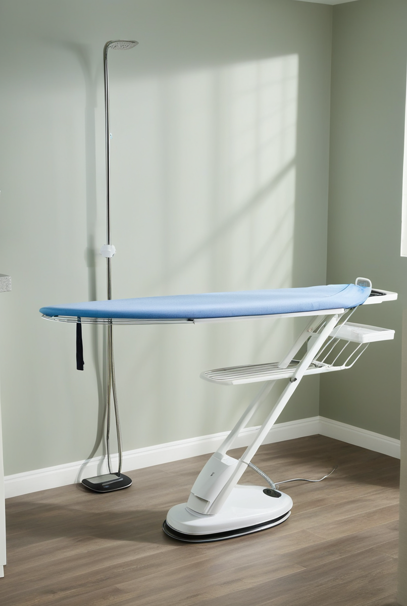 Для комфорта предусмотрены: большая подставка для утюга или специальный держатель для парогенератора‚ удобный кронштейн для шнура‚ а также и полка для белья. Встроенная розетка и удлинитель решают проблему подключения прибора.