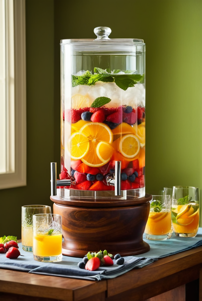 - Ягоды и мята: Смело добавляйте в диспенсер горсти свежих ягод — клубники, малины, голубики․ Они создают красивые цветовые слои․ Веточки свежей мяты не только украшают, но и придают напитку идеальный освежающий вкус․