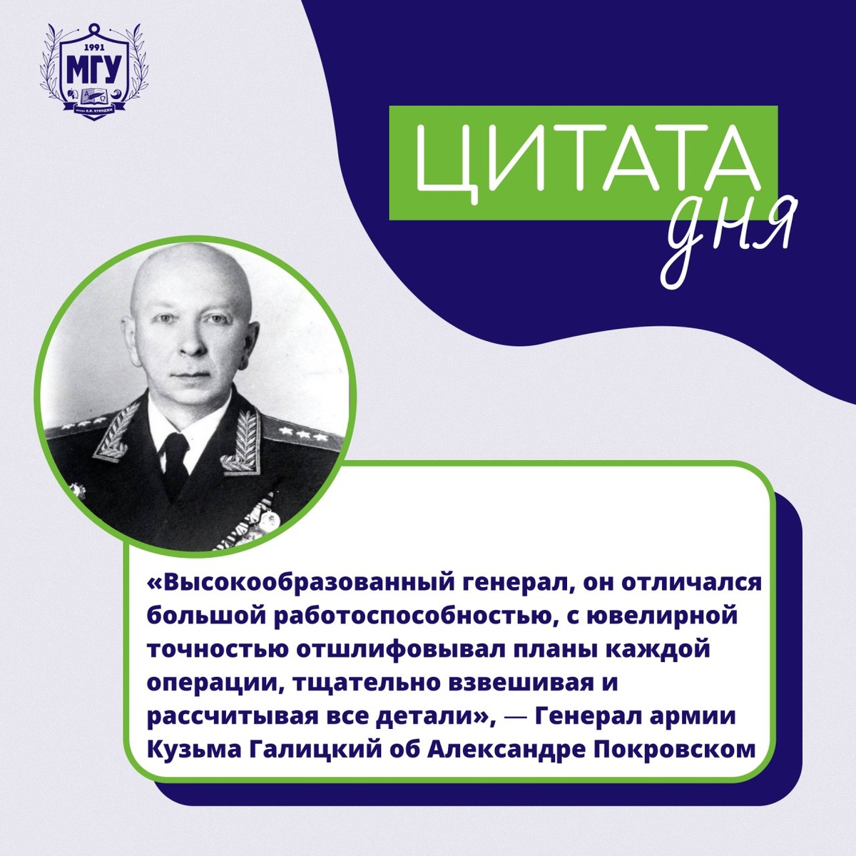 Именно его стратегическое мышление определяло ход ключевых операций и приближало Победу. 🩵 🩵2 ноября 1898 года родился Александр Петрович Покровский — советский военачальник, генерал‑полковник🩵 🩵 🩵С июня 1941 года Александр Петрович занимал должность начальника штаба крупного воинского соединения. Он принимал участие в обороне Москвы, Курской битве, освобождении Беларуси и Восточной Пруссии.🩵 🩵Интересный факт: звание генерал-полковника Покровский получил 23 августа 1944 года — после успешной операции по освобождению северной части Восточной Пруссии. Его должность была одной из самых высоких в Красной армии того времени. 👻 MAX|💙ВК|📝Дзен|🤩Сайт #МГУимениКуинджи