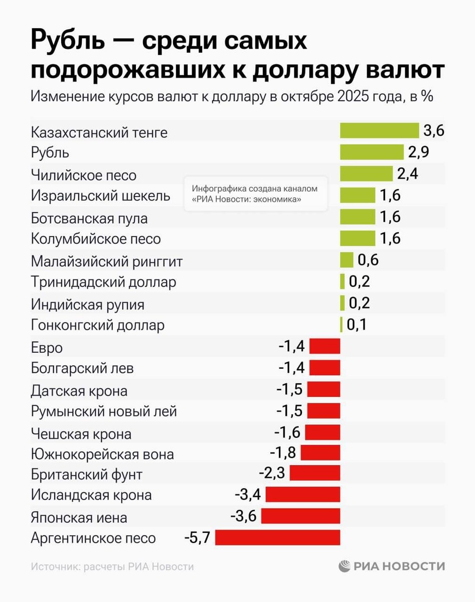Российский рубль в октябре стал второй самой подорожавшей к доллару валютой — за месяц он укрепился на 3,6%.