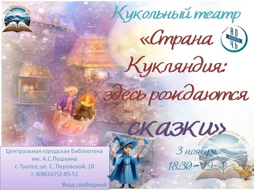 Кукольный театр "Страна Кукляндия: здесь рождаются сказки" 📍 Центральная библиотека А.С. Пушкина (г. Туапсе, ул. С. Перовской, д. 18) ⏰ 3 ноября 2025 18:30-19:30 📞 Справки по тел.: 8(86167)2-85-51 🎟 Вход свободный. @tuapse_afisha #библиотека #ночьискусств #туапсе #афишаТуапсе #кудасходитьвтуапсе #ноябрь #библиотека