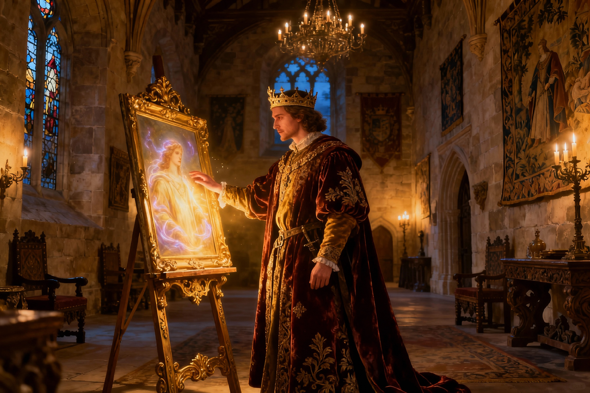 В одном далёком королевстве, скрытом среди высоких гор и зелёных долин, было обнаружено необычное чудо — волшебная картина, спрятанная в подземелье древнего замка. Картина была древней и покрыта толстым слоем пыли, но её загадочные краски переливались, хотя на самой картине не было четкого изображения только пятна сверкающих красок.