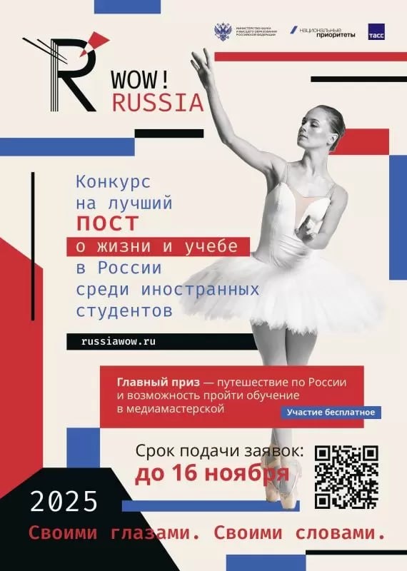 📢 Конкурс для иностранных студентов ТГУ «Национальные приоритеты» при поддержке Минобрнауки России и РУДН запустили конкурс «WOW! RUSSIA», направленный на формирование сообщества иностранных студентов, обучающихся в российских вузах, и продвижение российского образования за рубежом. Конкурс проходит по четырём номинациям: «Образование: учеба без фильтров», «Туризм и путешествия: Россия в кадре», «Культура: Россия между строк», «Жизнь: Россия научила». Ограничений по формату нет: от короткого вертикального видео до подборки из 5-10 фото с подводкой. Победители в каждой номинации выиграют поездку по России в рамках программы Росмолодёжи «Больше, чем путешествие», пройдут стажировку в региональном информационном центре ТАСС, a также примут участие в образовательной медиамастерской. Конкурс проводится в рамках национального проекта «Молодёжь и дети». Подробности👈