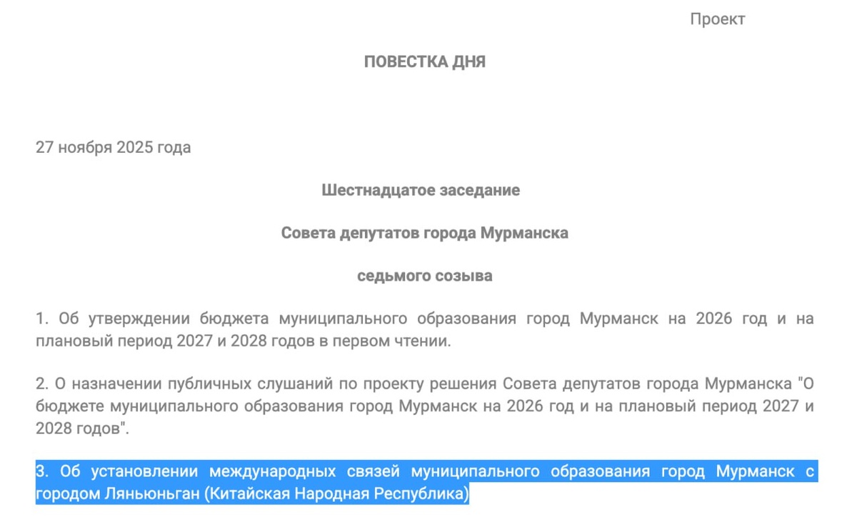 В ответ на пост В повестке дня очередного заседания мурманского Горсовета появился вопрос Об установлении международных связей муниципального образования город Мурманск с городом Ляньюньган (Китайская Народная Республика). Напомню, протокол о намерениях об установлении побратимских отношений между Мурманском и Ляньюньганом был подписан год назад предыдущим главой города Юрием Сердечкиным. ❄ «Арктический Обозреватель»