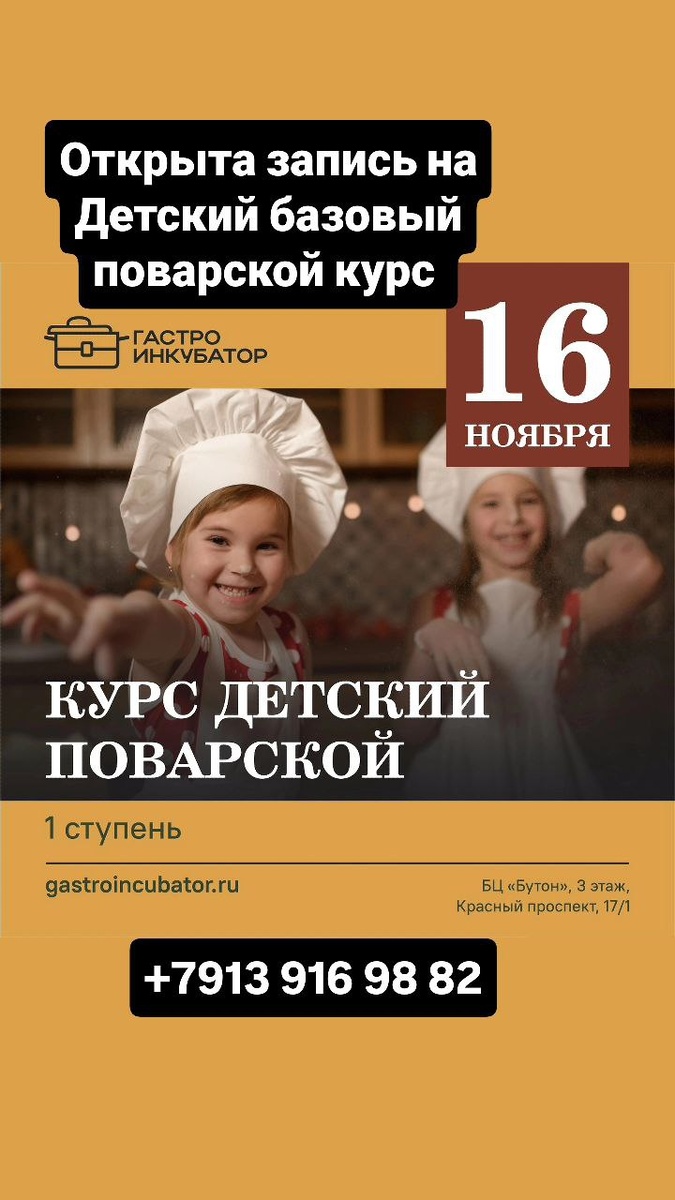 🧑🍳Ваш ребенок обожает проводить время на кухне? Помогает вам готовить и мечтает создавать кулинарные шедевры? Пора отдать его в руки профессионалов! 16 ноября стартует курс «Детский поварской» (1 ступень)! За 10 недель мы превратим интерес. в увлечение, а помощь на кухне – в уверенное владение ножом и плитой. Формат: Офлайн, по воскресеньям с 11:00-13:00. Итог: Не только знания, но и именной сертификат! Стоимость: 20 000 руб. за весь курс.📍 Места ограничены! Успейте записать вашего будущего шефа! ☎️+7913 916 98 82 +7 913 007 68 78
