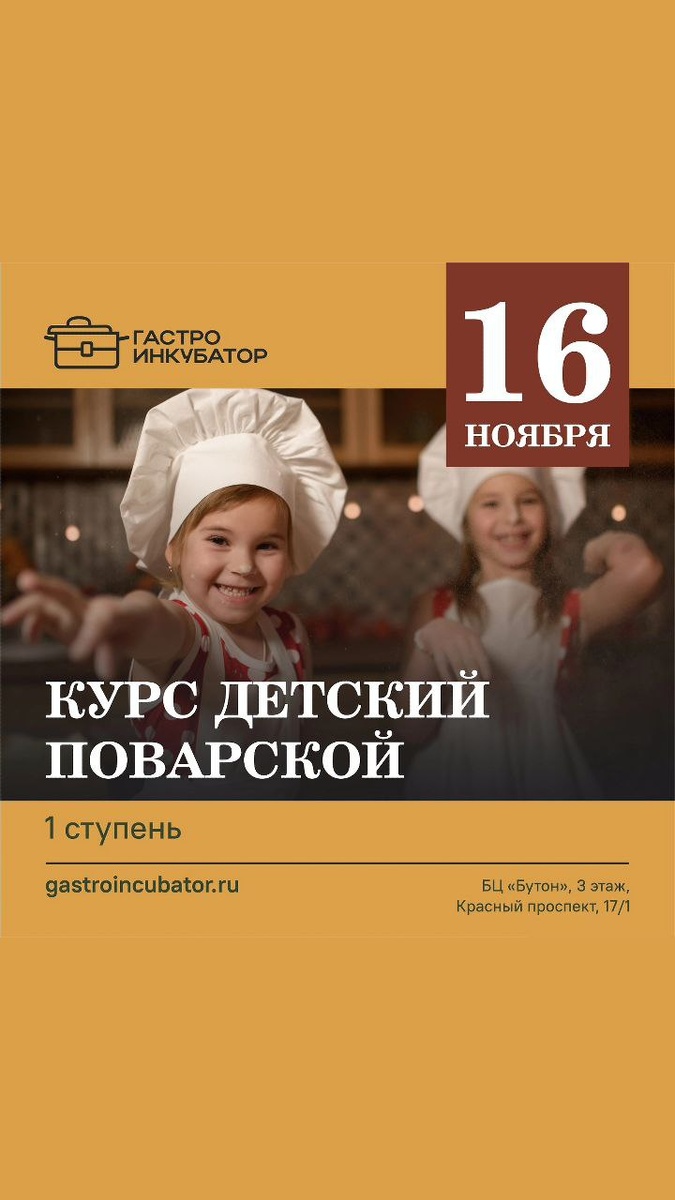 🧑🍳Ваш ребенок обожает проводить время на кухне? Помогает вам готовить и мечтает создавать кулинарные шедевры? Пора отдать его в руки профессионалов! 📅16 ноября стартует курс «Детский поварской» (1 ступень) За 10 недель мы превратим интерес в увлечение, а помощь на кухне – в уверенное владение ножом и плитой. Формат: Офлайн, по воскресеньям с 11:00 до 13:00 ч. Итог: Не только знания, но и именной сертификат! Стоимость: 20 000 руб. за весь курс. 📍 Места ограничены ! Успейте записать вашего будущего шефа! ☎️+7913 916 98 82 +7 913 007 68 78