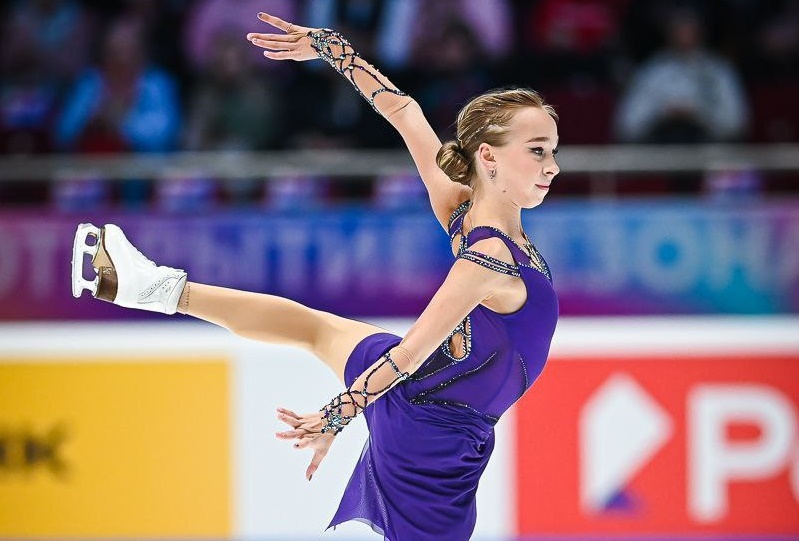 София Буза. Тренер Лариса Тарапат. 2А - чисто. 3Л+3Т - галка на тулупе и смазанный выезд. 3Ф - неясное ребро.