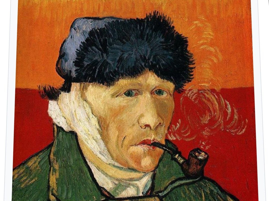 На портрете художник одет в тяжёлое зелёное пальто и чёрную меховую шапку. Его голова перебинтована, а во рту держит курительную трубку. Взгляд трудно описать : он кажется одновременно глубоким и поверхностным. Думает ли он о чём-то или его разум абсолютно чист? Возможную разгадку даёт задний план картины. Он разделён на 2 части: оранжевую и красную. Изначально тёплые цвета, в комбинации они рождают странную «звенящую» ассоциацию. Яркие оттенки мы видим, если сильно зажмуриваемся, испытываем чувство ярости или только что совершили резкий поступок. В такие моменты чувства руководят разумом: нас окружают лишь отголоски образов, цветовые пятна и звуки. Единственный элемент за который цепляется художник — трубка. Клубы дума выходят из неё медитативно, но и они скорее механически соединяют Ван Гога с действительностью. Поначалу «Автопортрет» кажется уютным, но чем дольше в него всматриваешься, тем сильнее он пугает и даже отталкивает. Он словно фотографии преступников перед арестам .