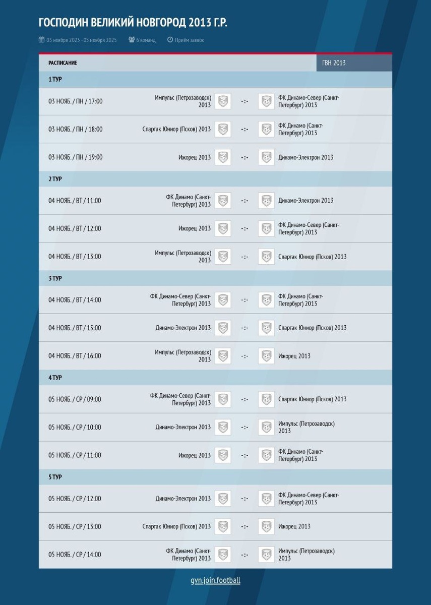 Выклдадваем расписание матчей турнира господин великий Новгород среди юношей 2012 - 2013 года рождения вчера на стадионе электрон состоялись первые матчи Импульс - фк динамо север