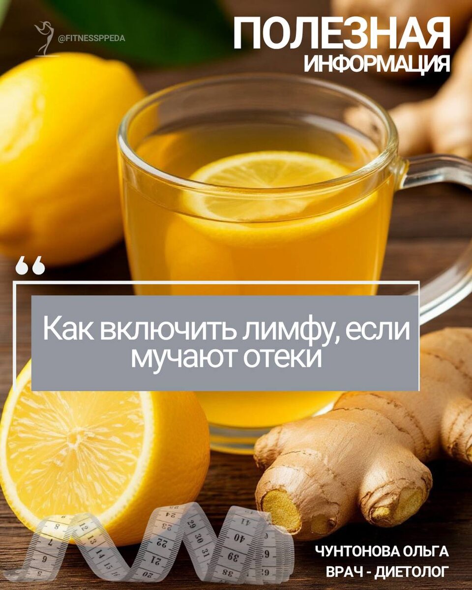 ✨ Как мягко запустить лимфоток и убрать отёки естественными способами Отёки — это не просто лишняя вода. Это сигнал, что тело устало, лимфа застоялась, обмен веществ замедлился. Вместо мочегонных важно мягко помочь организму восстановить движение жидкости. 🌿 Утро начните с тёплого чая с имбирём и лимоном. Имбирь усиливает кровообращение, лимон выводит лишнюю жидкость и запускает обмен. Это пробуждает тело и убирает утренние отёки. Рецепт чая ВКонтакте опубликован -> https://vk.com/fitnessppeda 💨 Добавьте дыхание 4–7–8: вдох — 4, задержка — 7, выдох — 8. Уже после первой минуты дыхание выравнивается, сосуды расширяются, тяжесть уходит. 🦶 Затем сделайте лёгкий самомассаж ног — от стоп к коленям, двигаясь снизу вверх. Он активирует лимфоток и снимает отёки. 🌸 Завершите мягким массажем живота по часовой стрелке. Живот — наша «мягкая помпа», он помогает лимфе двигаться и улучшает обмен веществ. 💛 Эти простые шаги ежедневно возвращают телу лёгкость, улучшают цвет кожи и снижают на