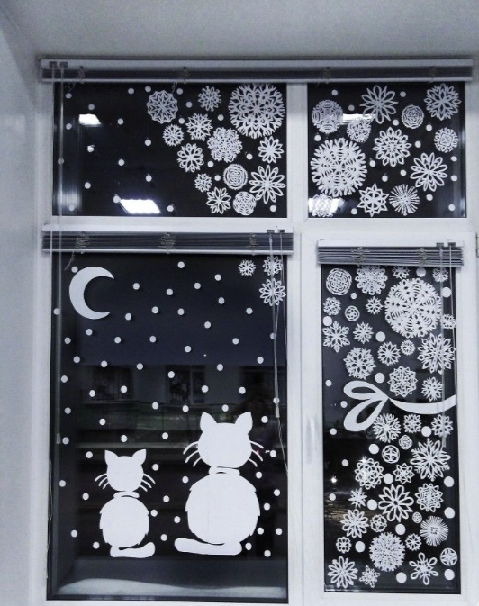 🎇 Представьте себе: зимний вечер, за окном кружатся снежинки, а вы уютно устроились дома с чашкой горячего чая. Вы смотрите на украшенное окно — и словно попадаете в сказку. Чёрно-белые узоры снежинок, силуэты кошек, задумчиво глядящих на луну, домики с заснеженными крышами, россыпь "снега" из снежинок разного размера — всё это создаёт неповторимую атмосферу уюта и предвкушения праздника. Сердце наполняется теплом, а на лице невольно появляется улыбка.