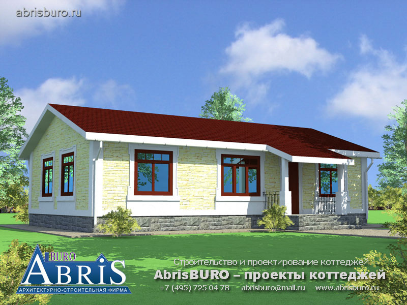 K039-100 Проект одноэтажного дома с крыльцом и двухскатной крышей из газобетонных блоков общей площадью 98,0 квадратных метров и габаритными размерами 14,5 x 9,0 метров в архитектурном бюро AbrisBURO.