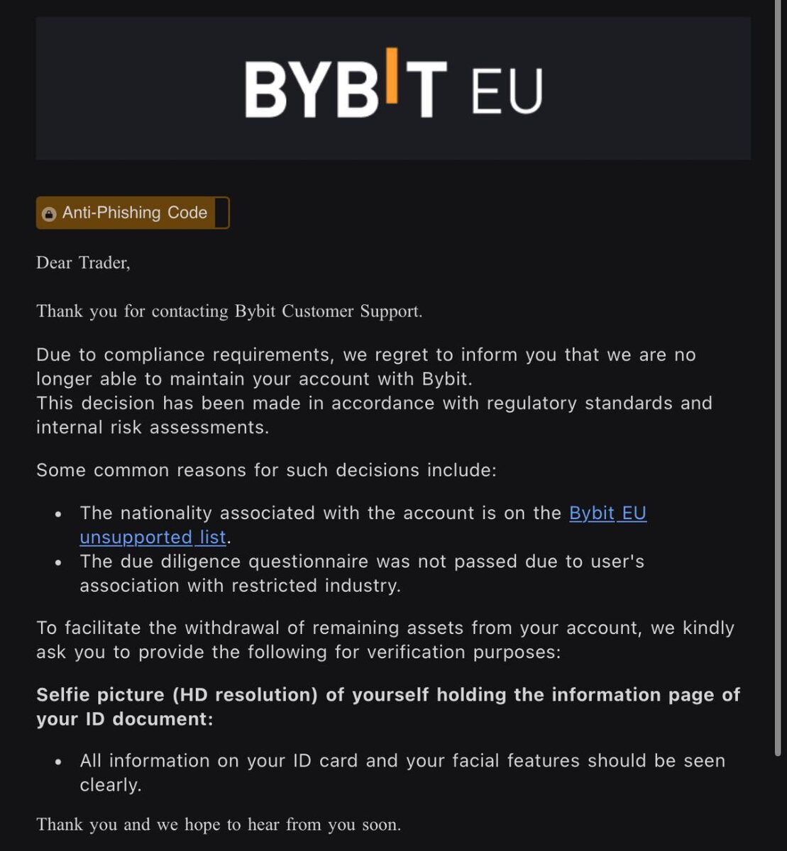 🔸Криптобиржа Bybit вслед за банком Revolut ввела ограничения для россиян. Европейское подразделение платформы Bybit EU приостановило открытие счетов для граждан России, включая тех, кто имеет вид на жительство в странах ЕС. Новые правила затронули и существующих клиентов.