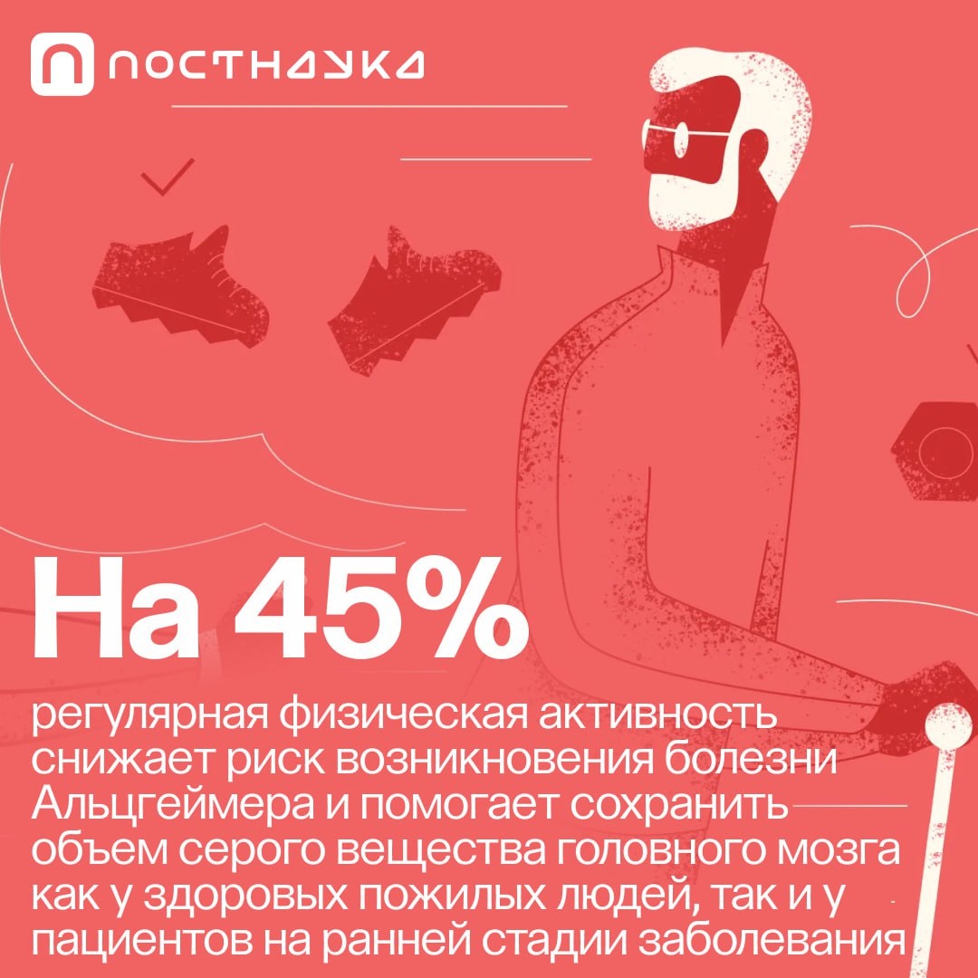 Физическая активность снижает фосфорилирование тау-белка, который скапливается в нейронах при болезни Альцгеймера и, по одной из гипотез, вызывает нарушения в работе нейронов. Но нужно помнить, что изменения в мозге при болезни Альцгеймера начинаются задолго до появления первых симптомов, поэтому важно стимулировать нейрогенез и поддерживать здоровье церебральных сосудов при помощи физических нагрузок даже если вы не ощущаете проблем. Как физические нагрузки влияют на конкретные процессы в организме? Разбираем в гиде «Наука спорта»: https://postnauka.org/link/sportsci_tg.