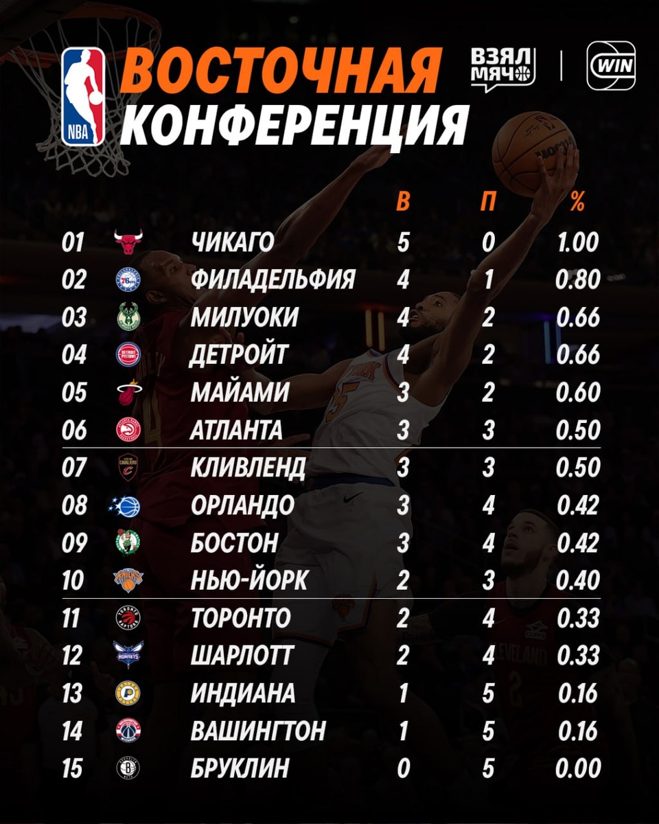 ⛹️♂️ Турнирные таблицы конференций НБА Непобеждённые «Оклахома», «Сан-Антонио» и «Чикаго» лидируют, в то время как «Новый Орлеан» и «Бруклин» всё ещё не видели побед в этом сезоне. На каком месте ваша команда? 👇🏼 🏀 ПОДПИШИСЬ — ЗДЕСЬ ЖИВЁТ БАСКЕТБОЛ!