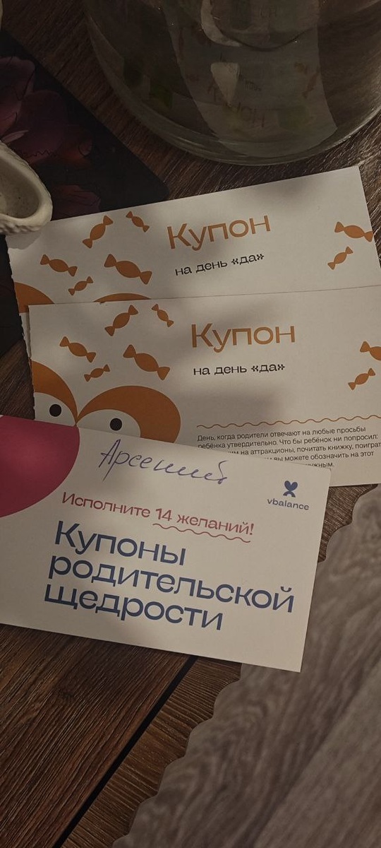 И ещё одна рекомендация от меня❤️ Купоны родительской щедрости. https://www.wildberries.ru/catalog/207067524/detail.aspx Прекрасный способ порадовать и удивить детей 🐤 Мои были в восторге. Плюс это создаёт атмосферу игры и спонтанности... Теперь у нас каждую субботу новое желание или хотелка... И парни уже сегодня начали думать над тем,что выбрать..)) Вчера , я весь день обоим говорила : "Да" 💃на любую просьбу)) Интересный опыт.... Главное заранее обсудить правила, чтобы счёт в банке не исчез мгновенно 😅