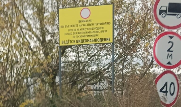 “Внимание! Вы въезжаете на частную территорию. Проезд на улицу Плодородную только для жителей Мегаполис-Парка по госномерам машин. ВЕДЕТСЯ ВИДЕОНАБЛЮДЕНИЕ”.