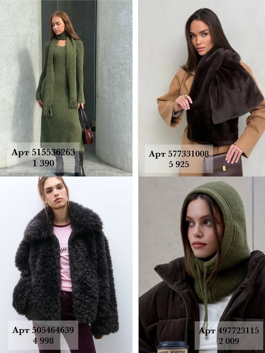 Зима — это время, когда мягкие материалы и глубокие оттенки работают фоном для сильной, продуманной простоты. В этой подборке — вещи, которые собирают образ без суеты: уютный трикотаж, объемные пуховики, благородные коричневые тона и практичная обувь. Ниже — подробный разбор строго по порядку, как на фото, с артикулами и ценами. Для каждой позиции — мой стилистический совет.
