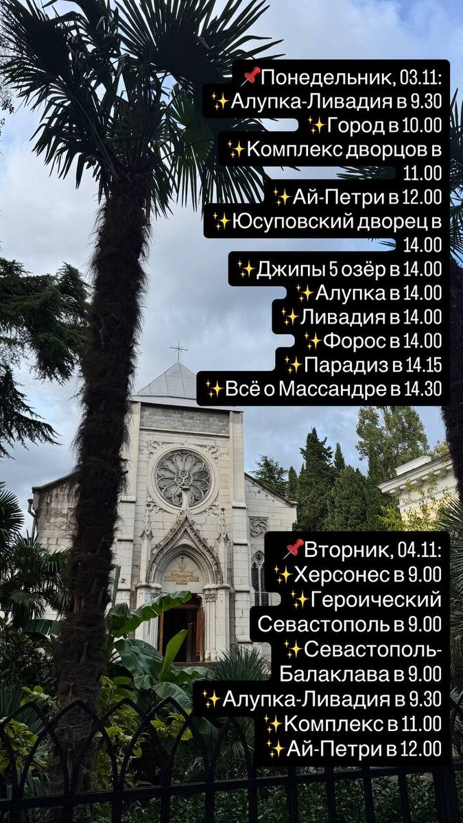 РАСПИСАНИЕ ЭКСКУРСИЙ 📲 +7(978) 721-36-60 🌏 https://yalta-ex.com #экскурсиипокрыму #путешествияпокрыму #отдыхвкрыму #экскурсиикрым #экскурсииялта #экскурсиибахчисарай #экскурсииайпетри #айпетри #канатнаядорога #ливадийскийдворец #воронцовскийдворец #массандровскийдворец #балаклава #большойканьонкрыма #джиптуры #винодельникрыма #дегустациикрым