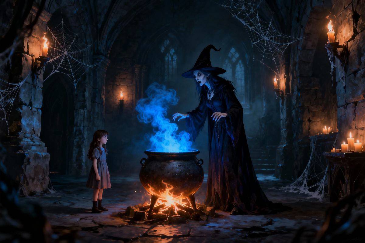 Жила-была в тёмном лесу старая ведьма. Она была хитра и сильна, а больше всего гордилась своим волшебным котлом, который стоял в центре зала ее мрачного дворца. Этот котёл был необыкновенным — стоило в него положить нужные травы и произнести заклинание, как он начинал сам варить любое снадобье, какое только можно вообразить.