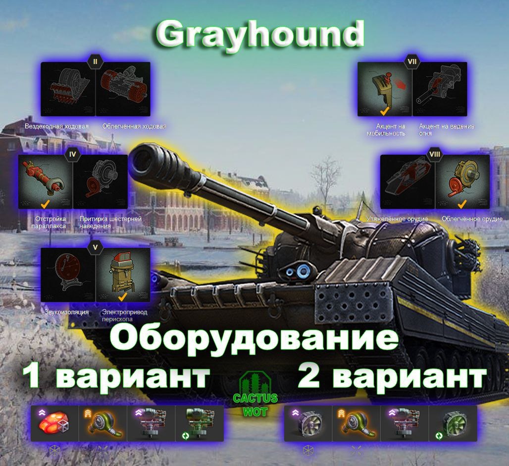 🇺🇸 Grayhound 🏦Тяжелый танк поддержки 10 уровень. 🔼Оборудование и полевая модернизация танка Grayhound на картинке♌️ ➕Плюсы танка 💱Убойное кассетное орудие с двумя снарядами в магазине, до 1500 единиц урона за ~10 секунд. 💱Хорошая броня башни 300 мм и приведённая броня корпуса (НЛД ~270 мм, ВЛД ~320 мм). 💱Хорошая удельная мощность (~18.5 л.с./т) и максимальная скорость 50 км/ч дают хорошую динамику для тяжёлого танка. Позволяет оперативно менять позиции и эффективно поддерживать союзников. 💱Углы склонения орудия (-10°) дают преимущества при игре от рельефа. ➖Минусы танка 📉Полная перезарядка составляет 36 секунд. 📉Много зон пробития. 📉Вязкий поворот корпуса (24°/с) и башни (30°/с) 📉Разброс на 100 м (0.4 м) и долгое сведение (3.0 сек) страдает точность на дистанции. 📉Скорострельность: 2.93 выстрела/мин и средний урон в минуту около 2200 ед. (ниже среднего для тяжёлых танков 10 уровня). Нужно больше инфы? ⬇️⬇️⬇️⬇️⬇️⬇️⬇️⬇️ #базазнаний@CactusWOT #Grayhound@CactusWOT #миртан