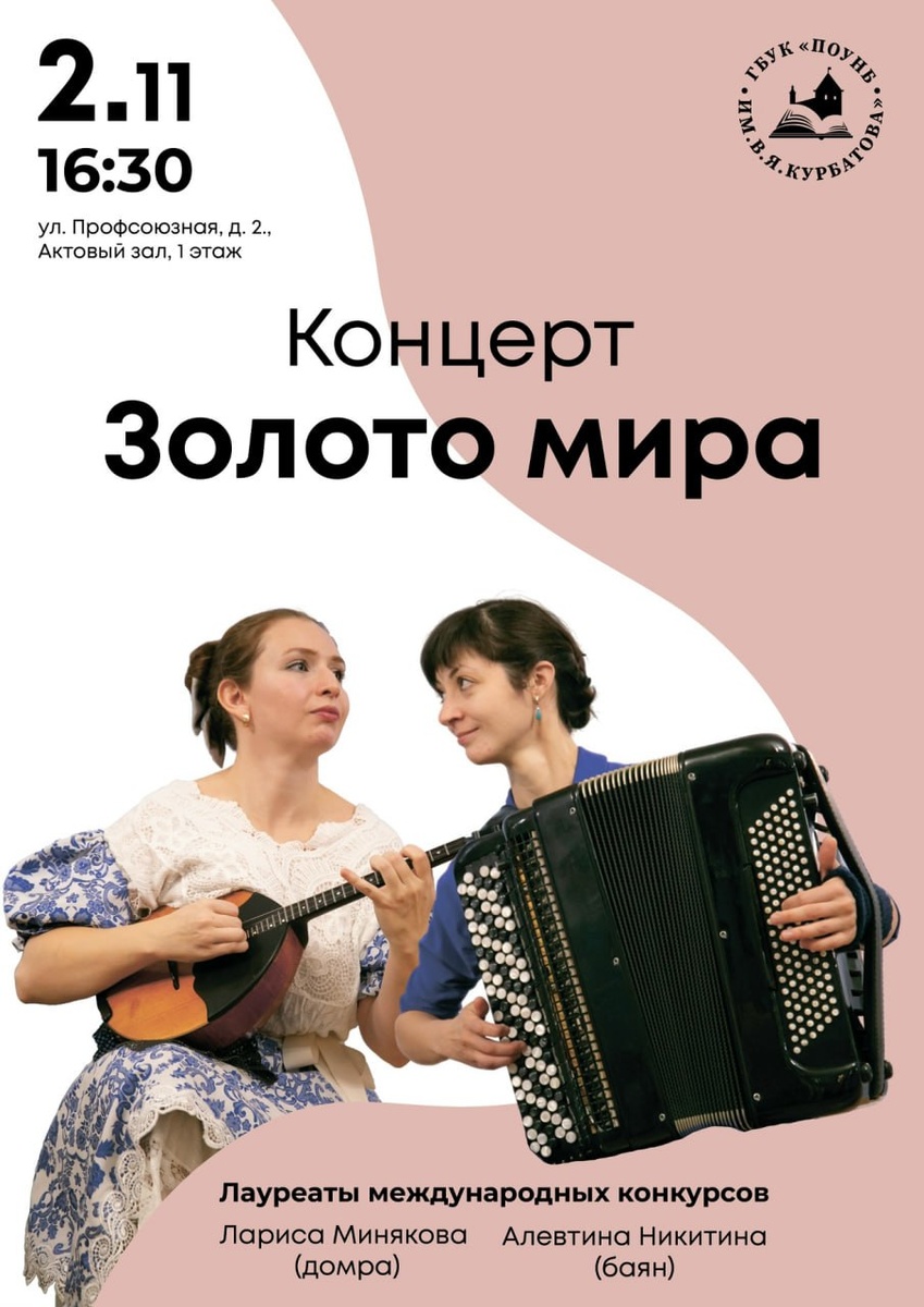 Сегодня, 2 ноября, в 16:30 в актовом зале Псковской областной библиотеки состоится музыкальный вечер «Золото мира». В программе выступление лауреатов международных конкурсов - Ларисы Миняковой (домра) и Алевтины Никитиной (баян). Известные своим мастерством и эмоциональной отдачей, музыканты представят слушателям новое звучание знакомых мелодий. В концерте прозвучат колоритные обработки русских народных песен, зажигательный грузинский танец «Сачидао», а также легендарные танго Астора Пьяццоллы. Организаторы приглашают всех желающих прикоснуться к миру музыки и насладиться виртуозным исполнением. Вход свободный. Необходима регистрация по ссылке. Фото: Псковская областная библиотека