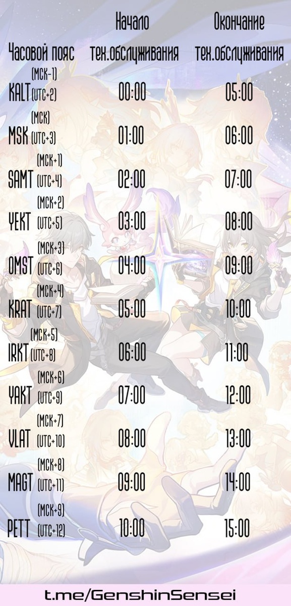 🕓 График отключения серверов HSR 5 ноября сервера HSR будут закрыты на 5 часов для технического обслуживания. Подробный график отключения серверов по каждому часовому поясу смотрите в картинке ⬆ 🎁За технические работы мы получим 300 🗿 в качестве компенсации #хср_официально / Подпишись на Сенсея
