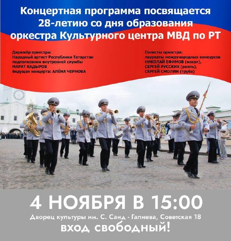 Концерт духового оркестра Культурного центра МВД 🗓️ 4 ноября ⏰ 15:00 💸 бесплатно 🏫 ДК им.С.Саид-Галиева 📍 Пос. Дербышки, ул.Советская, 18 В День народного единства Оркестр под руководством народного артиста РТ, подполковника внутренней службы Марата Кадырова исполнит программу, посвящённую героическим страницам истории нашей страны. В этот день прозвучат знакомые мелодии, торжественные марши и душевные композиции, которые вдохновляют и объединяют поколения. ➡️ ПОДРОБНОСТИ ⬅️ ❗️ Детская Афиша | Казань Больше информации в нашей группе, переходите