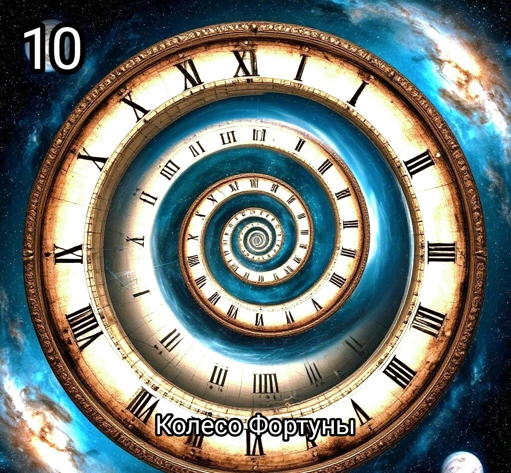 В мире Таро старший аркан Колесо Фортуны отражает смену кармических циклов и эволюций жизненных воплощений, что переменчивость неотъемлемая часть бытия в переходах и круговоротах Судьбы, что за каждым периодом спада следует подъём, призывая нас гармонично вписываться в ритмы перемен, оставаясь верным себе и сохраняя оптимистичный взгляд на будущее, к которому мы всё должны быть готовы. В личных отношениях и в социуме пришел момент трансформации на более глубоком уровне,важно научиться адаптироваться к любым изменениям, так и проведение самоанализа в погружении в Себя, с умением переключаться с внутренних процессов на процессы происходящие в социуме. Этот аркан учит нас принимать жизнь в её динамичном развитии, видя в каждом повороте судьбы возможности для личных перспектив во всех сферах жизни, так и для духовного роста. Посмотрев на картинку - мы видим не зацикленное, как болото, колесо, а открывшуюся сейчас спираль эволюции для всех Сознаний, т. к. открылись новые возможности дл