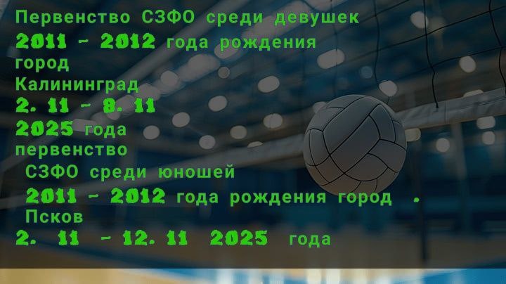 Свой старт ✔️🚀 берёт первенство СЗФО по волейболу 🏆🏐 среди девушек и юношей до 16 лет. В двух городах пройдут всероссийские соревнования. В ✔️Калининграде и Пскове ✔️ команда девушек на групповом этапе сыграет со следующими командами: ➡️Архангельской области, ➡️Ярославской области,➡️Ленинградской области, ➡️Республики Коми, ➡️Вологодской области, ➡️ Калининградской области. Сегодня в 10:30 по местному времени Калининграда. По мск — 11:30. Девчонки сыграют с республикой Коми. Прямая трансляция встречи:📎 ▶️https://volley.ru/games/01K90QNWV7FT3J1RXMFR2X1S09?t=glbtab-1. Юноши сыграют со следующими соперниками: 🚩Республика Коми, 🚩Вологодская область, 🚩Архангельская область. В 15:45 уже первая игра. С Вологодской областью. Ссылка на прямую трансляцию 📎▶️ https://volley.ru/games/01K9067QC8YZ9A0SWHGV7J128R?t=glbtab-1 #первенство #СЗФО #валейбол