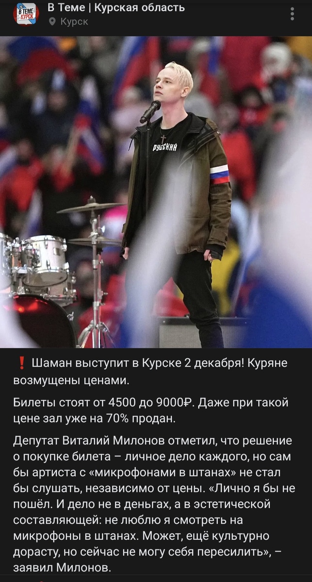 Зашла почитать местные новости и тут вижу, что к нам приезжает Шаман. Но больше всего меня удивляет, то что кто то пойдёт на него смотреть за такие деньги😱 Конечно вкусы у всех разные, но по мне этот певец мягко говоря не цепляет. Я уже как то писала статью, что его стиль одежды напоминает Майкла Джексона. Стилисты явно у него не заморачиваются. Хотя поклонники Шамана меня уверяли, что он сам образы себе придумывает, в таком случае стилист бы ему точно не помешал. Исполнение песен как-то средненькое, у меня в голове не всплывает ни одна из его песен даже песня, которая звучала из всех утюгов "Я русский" почему-то не всплывает в памяти. Короче популярность мне его непонятна. Я тут задумалась, а на чей бы концерт я бы вообще пошла за такие деньги🤔? Когда то давно была в клубе там выступала группа " Время и стекло". Оказалась я там благодаря сестре. Было весело, по после концерта пришлось уйти, так как уж слишком настырно с нами пытались познакомиться.. Через пару лет сестра