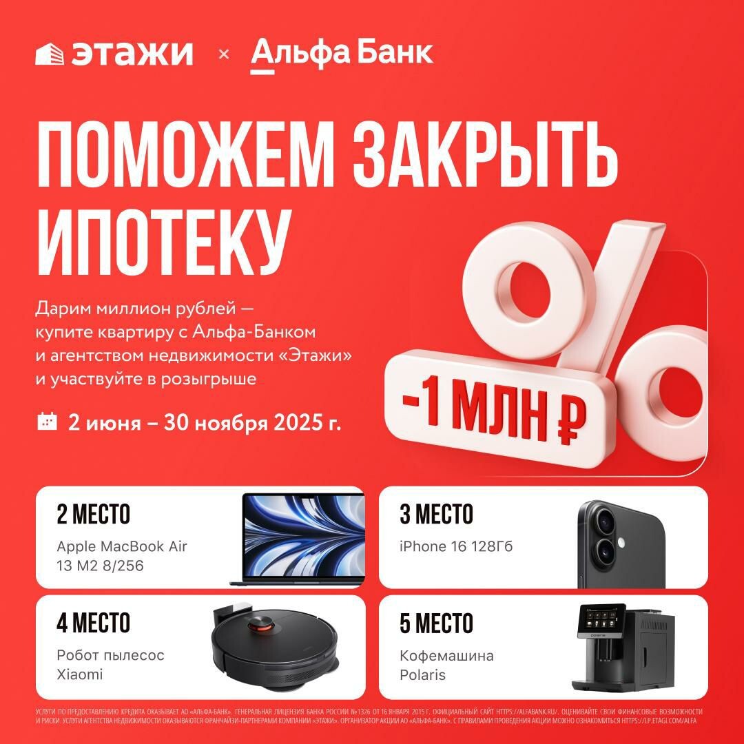 До конца розыгрыша миллиона остался месяц 🎁 Да-да, совместный розыгрыш Альфа-Банка и «Этажей» подходит к финалу✨ Главный приз — миллион рублей, который можно направить на частичное или полное погашение ипотеки. А еще разыгрываются ноутбук, смартфон Apple и другие призы. Как принять участие: 1. Приобрести недвижимость через «Этажи» 2. Оформить ипотеку в Альфа-банке (по рыночной или льготной программе) 3. Заключить страховой полис в «АльфаСтраховании» 💬 Акция действует до 30 ноября 2025 года. Победитель будет выбран случайным образом. Не упустите шанс — миллион может стать вашим!