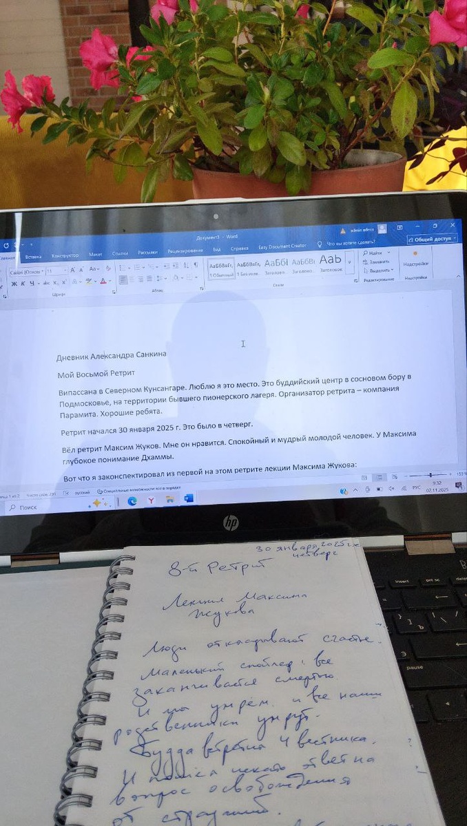 8-й ретрит, часть 1 Дневник Александра Санкина Мой Восьмой Ретрит Випассана в Северном Кунсангаре. Люблю я это место. Это буддийский центр в сосновом бору в Подмосковье, на территории бывшего пионерского лагеря. Организатор ретрита – компания Парамита. Хорошие ребята. Ретрит начался 30 января 2025 г. Это было в четверг. Вёл ретрит Максим Жуков. Мне он нравится. Спокойный и мудрый молодой человек. У Максима глубокое понимание Дхаммы. Вот что я законспектировал из первой на этом ретрите лекции Максима Жукова: Люди откладывают счастье. Маленький спойлер: всё заканчивается смертью. И мы умрём, и все наши родственники умрут. Будда встретил 4 вестника. И пошёл искать ответ на вопрос освобождения от страданий. И нашёл ответ полного освобождения от страданий, полного счастья. Горсть листьев Я учу небольшому количеству вещей. Это 4 Благородные Истины. Удовлетворение органов чувст является неудоволетворительным. Для божеств, пребывающих в духовном счастье, погружение в телесный мир