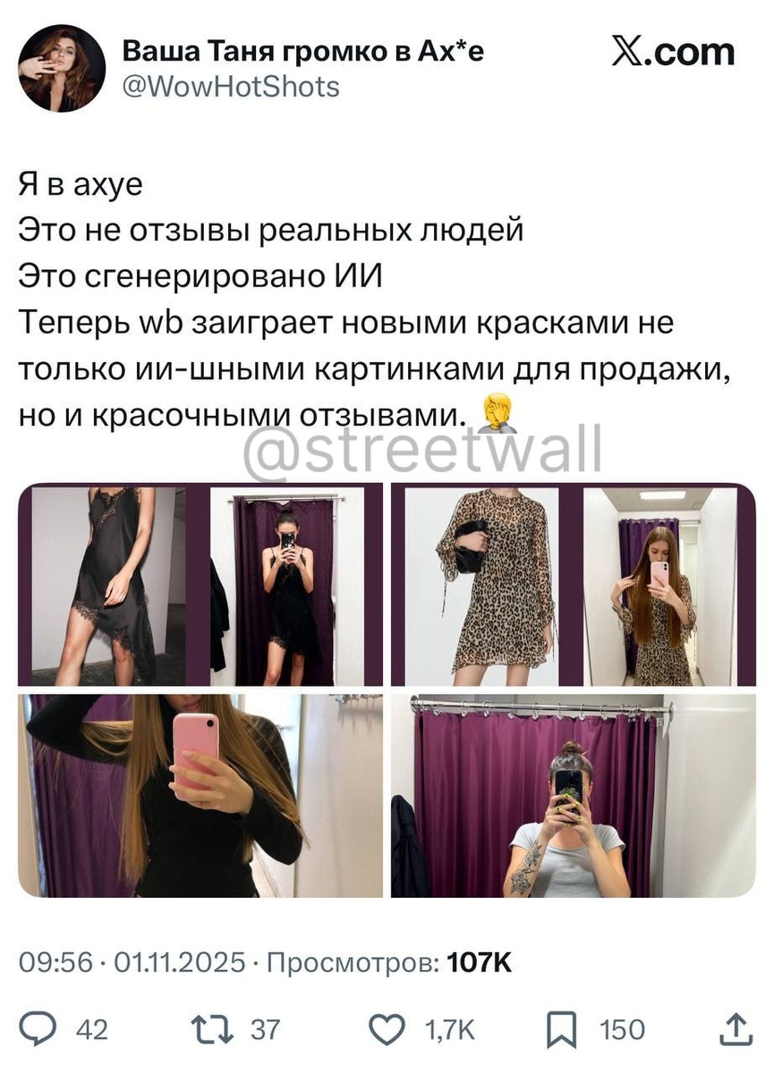 Искусственные отзывы с фальшивыми фото завоевывают маркетплейсы На маркетплейсах стали активно появляться фальшивые отзывы с использованными ИИ-фотографиями. Отличить их от настоящих очень сложно, и одежда на таких изображениях часто выглядит заманчиво, даже если в действительности она совсем не такая. ────────── ⚡️Важные новости – без лишнего шума!⚡️ Подпишись на канал и получай только суть: оперативно, чётко, по делу! 👉 ИнфоСплетник | @infospletnik