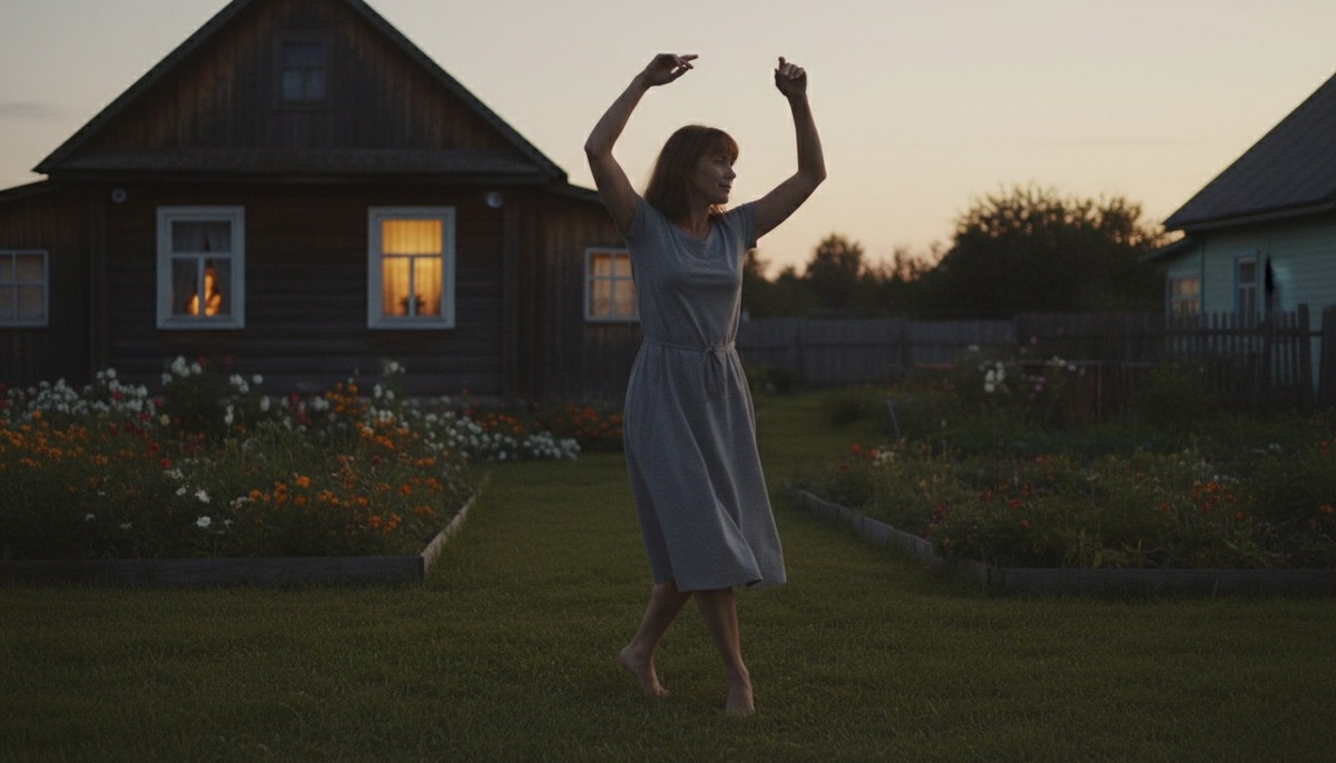 Марина Петровна включила музыку так громко, что соседи наверняка проснулись. Половина одиннадцатого вечера, а она крутится по своему крошечному двору под латиноамериканские ритмы. Босиком. В старом халате. Я смотрю на неё из-за занавески и не понимаю. — Света, ты опять подглядываешь? — муж отрывается от телевизора. — Не подглядываю. Просто смотрю. — На что там смотреть? Женщина с приветом танцует. Вот именно. С приветом. А я сижу дома и завидую женщине с приветом. Марина переехала к нам в деревню полгода назад. Купила старый дом Ивановых, который три года пустовал. Все ждали, что приедет семья с детьми или пенсионеры из города. А приехала она. Одна. В пятьдесят пять лет. — Развелась, — шепчутся соседки. — Или овдовела. — А может, просто с ума сошла, — добавляет тётя Клава. Но Марина не похожа на сумасшедшую. Или на несчастную разведёнку. Она похожа на... живую. Странно это звучит, но именно так. Утром встаёт в шесть. Поливает цветы. Громко напевает. В магазине здоровается с продавщицей
