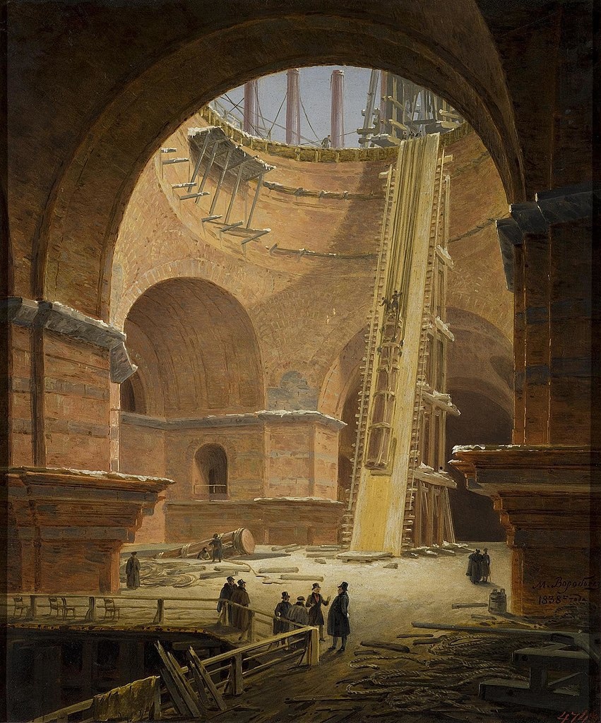 По представлению Вашему от 24 Декабря прошлого года, о подъеме колонн на купол: Комиссия определила: по соображении всех обстоятельств сей важной операции оказывается, что предлагаемый Вами способ поднятия колонн, соответствует настоящему предмету, и обнадеживает несомненность в успехе, а потому утвердив таковой способ и разрешив воспровесть оный в исполнение с тем чтобы на производство работы составлены были надлежащие условия; представленные же чертежи по учинении на оных надписи, передать в Контроль для хранения и соображения, при выполнении сей операции. Относительно приготовления бронзовых баз, требование Ваше объявить Г-ну Берду; О чем к сведению и зависящему распоряжению сим и предписывается.