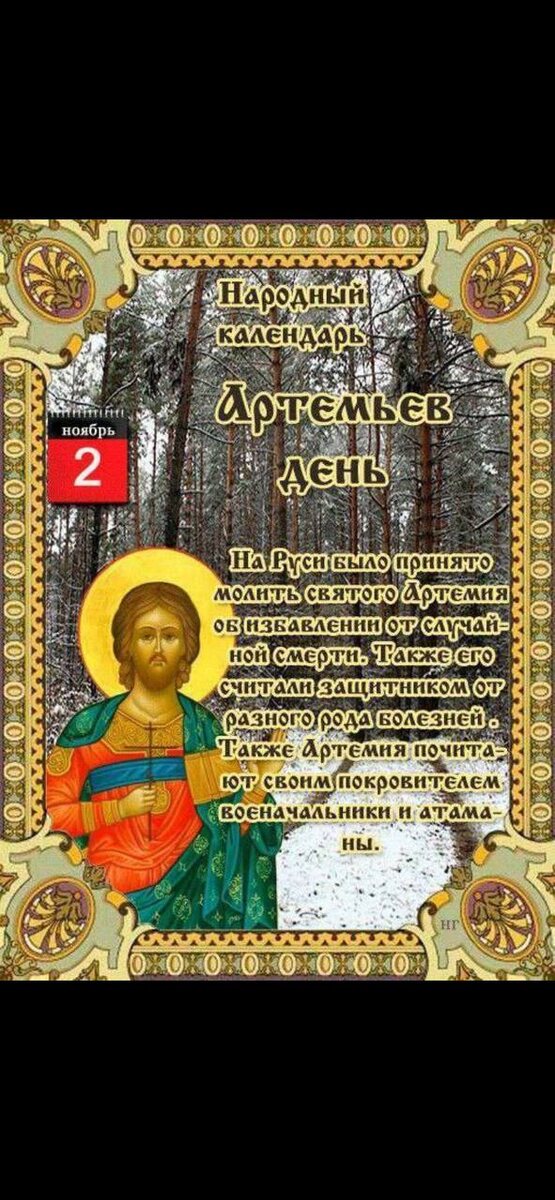 2 ноября 2025 года отмечается Артемьев день, посвященный Артемию Антиохийскому. В этот день актуально квасить капусту для укрепления здоровья, готовить щи и голубцы, звать гостей. Молятся святому о здоровье военнослужащих и помогают нуждающимся. Мужчины занимаются ремонтом. Проводят защитные ритуалы от злых сил, используя соль и травы. Приметы погоды: низко летающие ласточки, стрекочущие кузнечики, спящая клубком кошка – к перемене погоды. Обильный урожай рябины, гром – к суровой или теплой зиме соответственно. Запреты: смотреть на ночное небо, ходить в лес после заката, давать в долг, ссориться, начинать новые дела, оставлять двери незапертыми, шить после заката, выносить мусор вечером, рассказывать о снах до полудня.