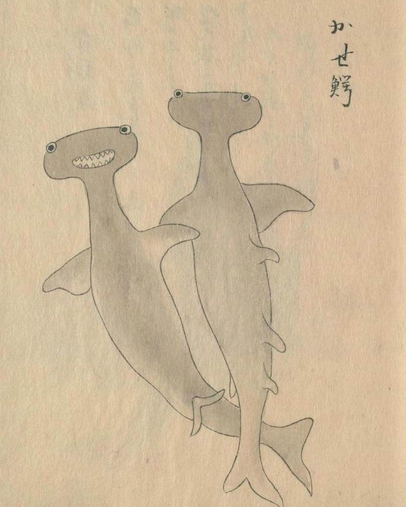 На что же они похожи? Иллюстрация встречается в сборнике «Оки-но куни санбуцу эдзу тюсе» (隠岐国産物絵図注書) середины XVIII века (в ряде публикаций указан 1735 год). Это местный каталог природных и промысловых ресурсов, выполненный в эпоху Эдо. Помимо флоры и перечня промыслов, в книге встречаются выразительные изображения морских обитателей. А самое известная — это как раз иллюстрация с парой акул-молотов. Так на кого же они похожи?